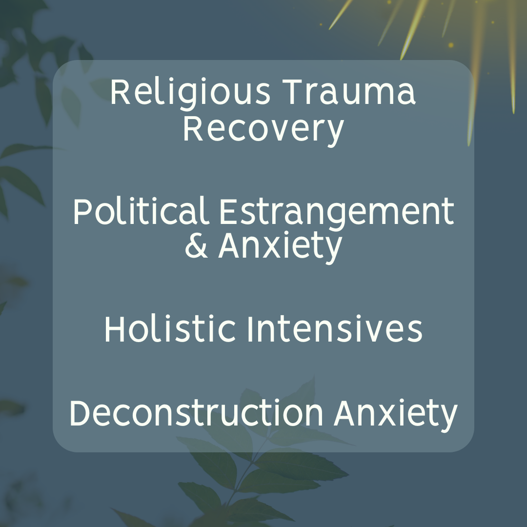 I help clients heal from religious trauma and high-control faith systems. Together, we untangle harmful beliefs, rebuild self-trust, and reconnect with your body, emotions, and identity in a safe, supportive space grounded in curiosity and care.